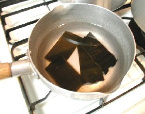 【5】鍋に出し昆布4〜5枚(長さ10cm)と水500ccを入れ火にかけ沸騰する