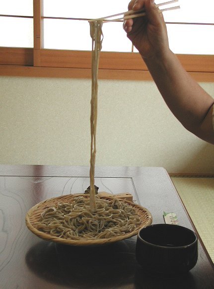 上の画像は、1m角の伸し板に裁った蕎麦をひろげてみました。麺棒は90cmです。
