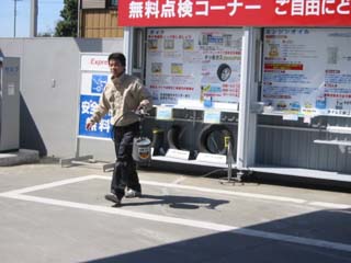 空気圧をチェックするヨシ腹。なんとリアは1Kにも届いてませんでした・・・。恐るべし。このあと押しがけしたのはいうまでもありません。 |
