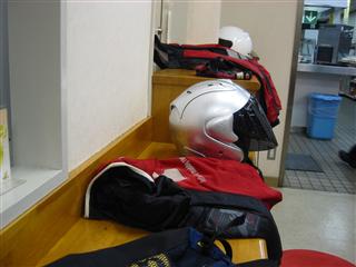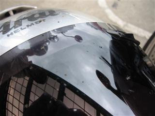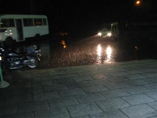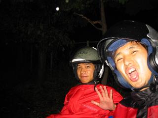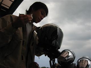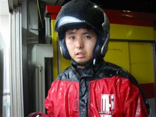 | びしびし降りつけ、合羽を着ていても痛い。BB弾を連射されているようなそんな気分。しかも雷。ピカッて。 | 連射され後の悲惨な状態。例のごとく ヘルメットかぶってるのに頭が濡れてる状態…もちろんシャツなんかもビショ |