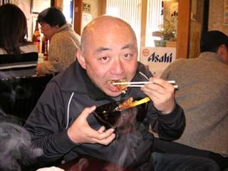 とろまんを食す、マッチャン。その後ろに近づくのはTONY氏?ウラさん?