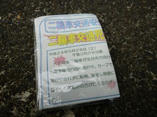 | そして走り出して数百メートルのところでいきなりおまわりさんに止められる・・・。やっちまった・・・と思いきや 「先週ここでバイクの死亡事故がありましたので、気をつけてくださいね。」とティッシュをもらう。 ビックリしたぜ〜。 そうだね気をつけようねと、気を引き締めなおし出発。途中、反対車線にてネズミ捕りやってた。だれも捕まってなかった。対向車に教えてやろうと張り切ってみたが1台しかすれ違わなかった。一応教えてやったが。 |